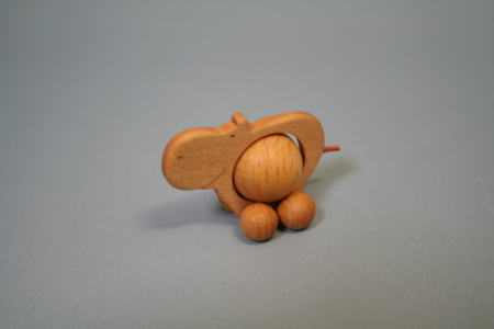 胴体、足が球でできた木製のカバ。長さ5p。顔のあたりを持って前に引くと、足が回転し、それにつれて胴体の球も回転する。そして同時に、球は転がり落ちる(笑)。