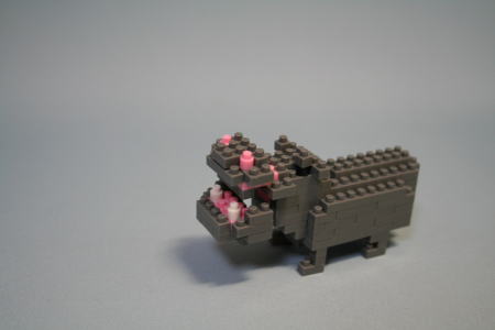 世界最小級ブロックという"nanoblock"のカバをいただいた。完成して、体長8.0pという小ささだ。説明書によると、「従来のブロックの半分、一つのポチが4mm」とのこと。その動物シリーズに、キリンなどと並んでカバが入っていた。