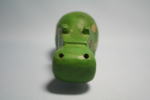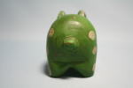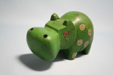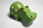 木製で黄緑色のカバ。白い水玉模様、丸くふくらんだ顔が特徴。いただきもので、どこで作られたか分からないが、アフリカのようでもあり、アジアのようでもある。