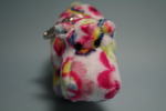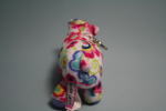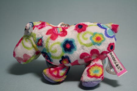 花模様が美しいカバのぬいぐるみ。キーホルダーとなっている。肌触りがよく、作りがていねいだ。明るい色模様は、春が近づいてくる季節にふさわしいと思う。