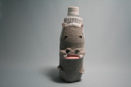 カバのペットボトル・カバー。綿のニット。顔、手、シッポがついている。