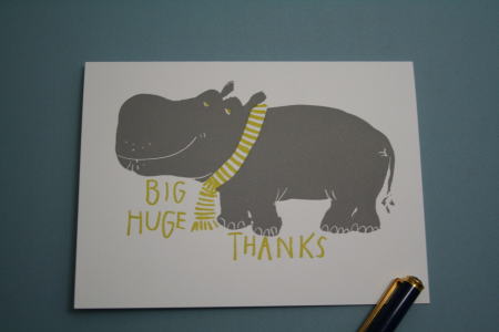 カバのカード。マフラー(ネクタイ?)をしたカバの表情がおもしろい。「BIG HUGE THANKS」と書かれている。