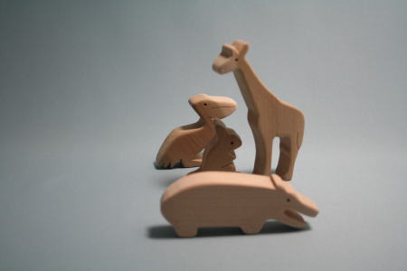 札幌・円山動物園認定の木製動物セット。草の実工房作。カバ、キリン、ウサギ、ペリカンがパズルのように小箱に入っている。手に柔らかい感触がうれしい。