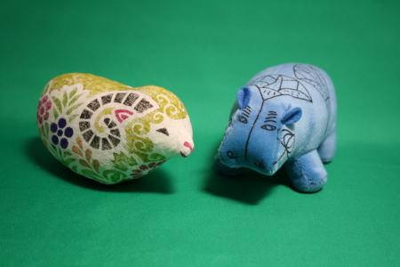 新年の干支とカバ シリーズ。8回目。ともに布製の羊とカバ。