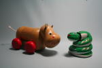 木製カバ(チェコ)と張り子のヘビ(日本)。 |
