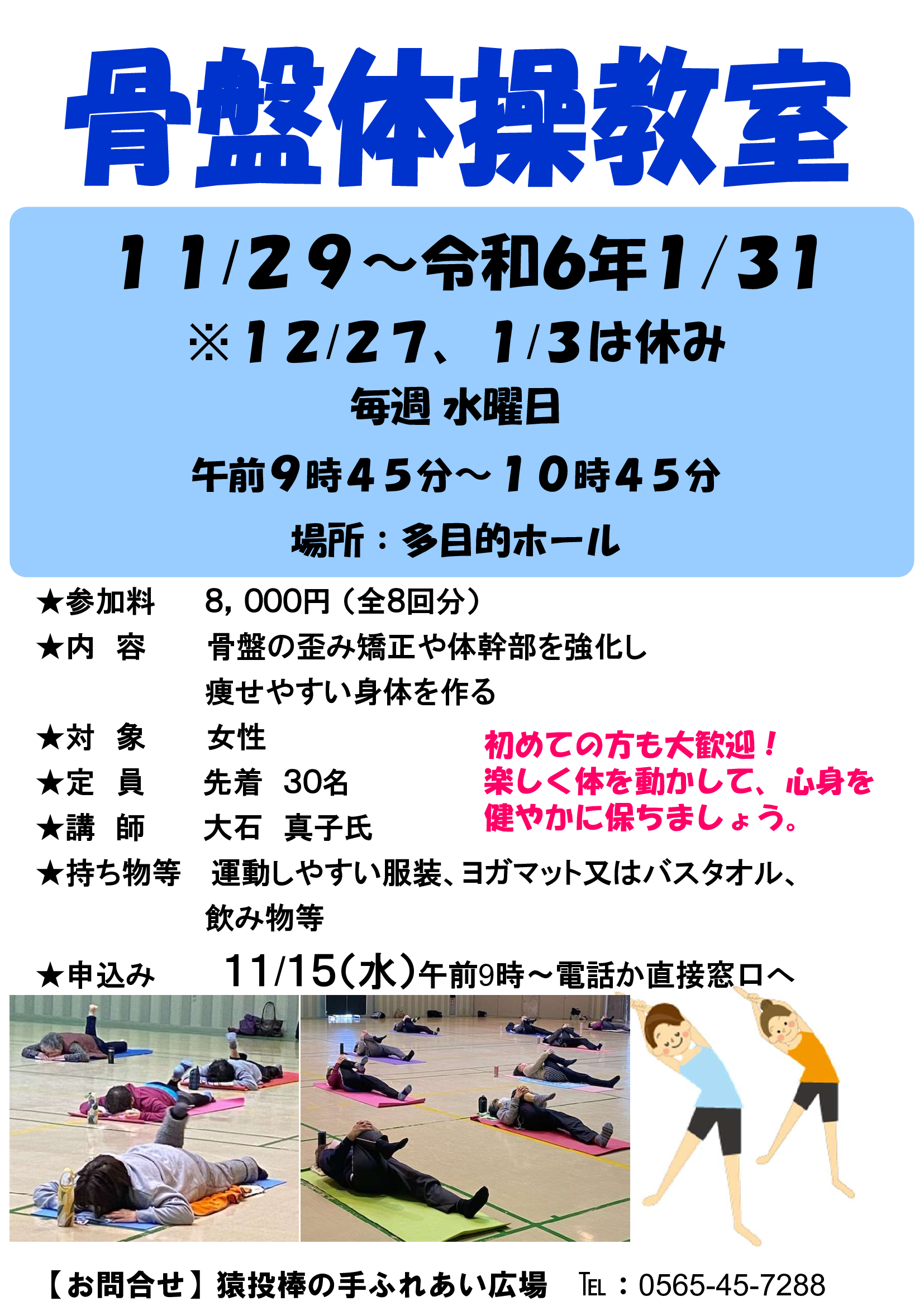 運動のできる服装、汗ふき用タオル、なわとび、ヨガマット、水分補給用飲料、室内シューズ(バレエシューズは不可) |