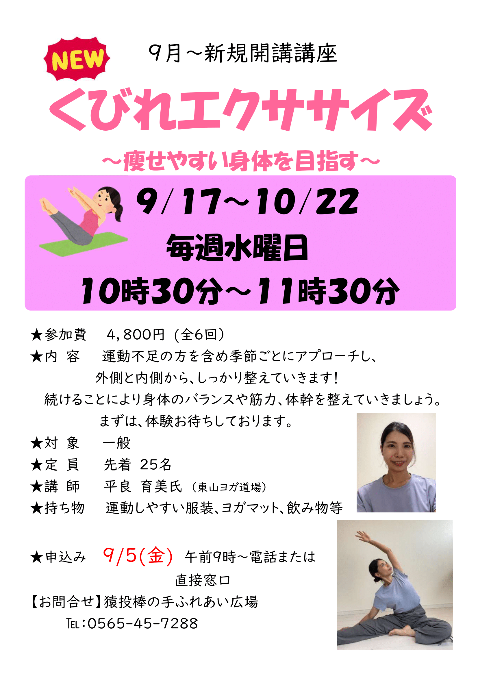 持ち物 運動しやすい服装、ヨガマット、タオル、飲み物等