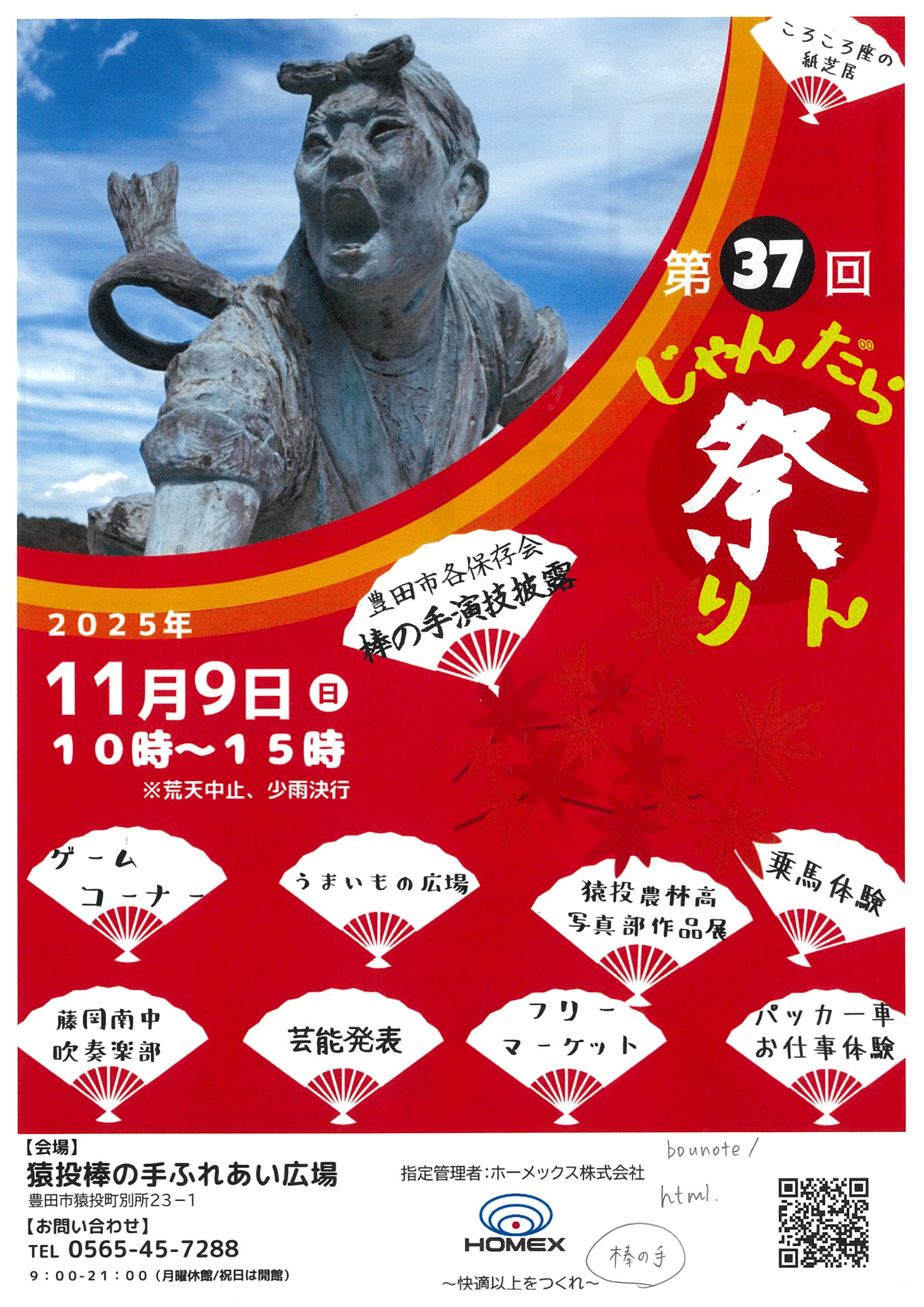 内容 豊田市各保存会『棒の手演技披露』、ゲームコーナー、うまいもの広場など、その他