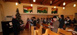 ↑(8)CS:トーンチャイムで、CSの生徒と保護者で「くすしきみ恵」を演奏しました。 |